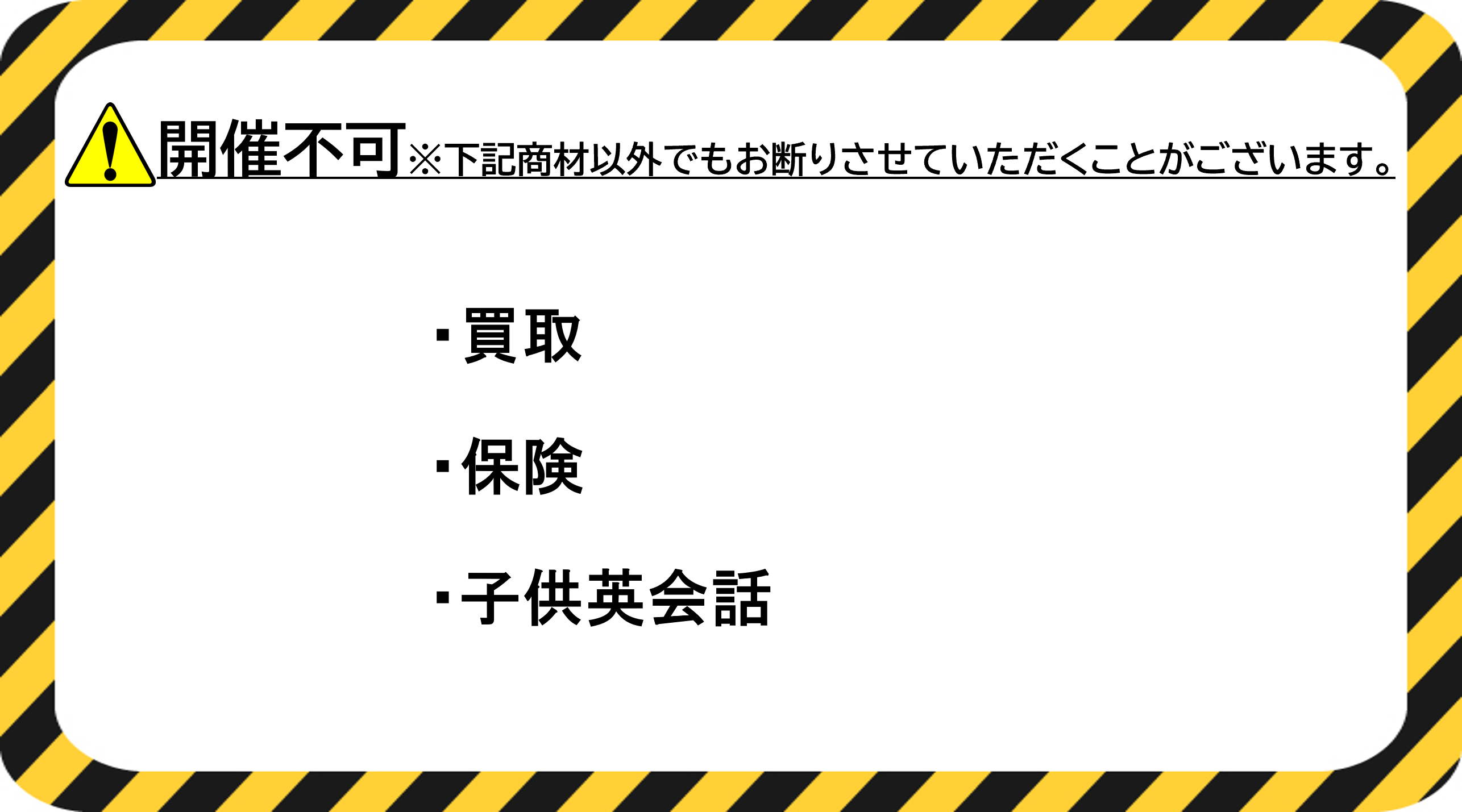 (13)会員がその営業について、諸官庁から許認可を受けられないとき、又は許認可の取消し、停止処分もしくはそれに準ずる指導、監督等を受け、利用するスペースの閉鎖や営業を停止し、営業を再開できる見込みが無いと当社が判断したとき。