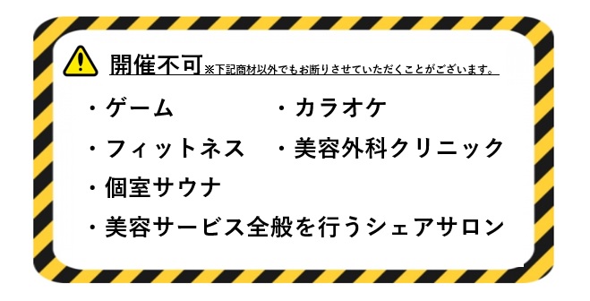 (13)会員がその営業について、諸官庁から許認可を受けられないとき、又は許認可の取消し、停止処分もしくはそれに準ずる指導、監督等を受け、利用するスペースの閉鎖や営業を停止し、営業を再開できる見込みが無いと当社が判断したとき。